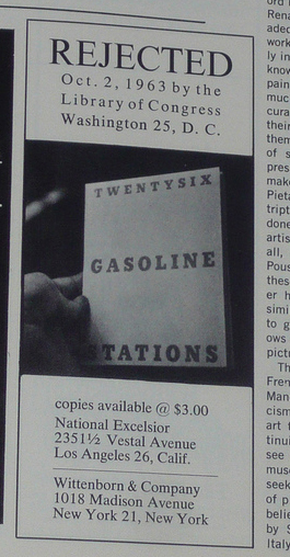 Die erste Auflage von Twentysix Gasoline Stations aus dem Jahr 1963 war zu einem Preis von 3$ erhältlich. Das Buch wurde zunächst von der Library abgelehnt und so kam es, dass Ruscha 1964 als Protest eine Anzeige in der Zeitschrift Artforum veröffentlichte.