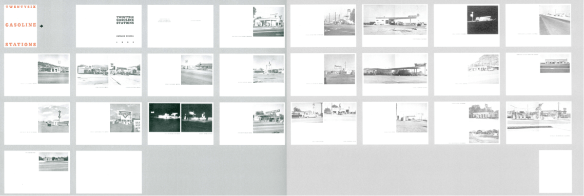 Ed Ruscha hat 1963 mit seinem ersten Künstlerbuch Twentysix Gasoline Stations für Aufsehen gesorgt. In dem kleinen Büchlein befinden sich lediglich 26 Schwarz-Weiß Abbildungen von Tankstellen, die Ruscha entlang der Route 66 ablichtete. Das anfangs von der Library abgelehnte Buch etablierte sich jedoch zu einem der gefragtesten Künstlerbücher der 1960er-Jahre und erreichte weltweit Kultstatus in Sammlerkreisen.