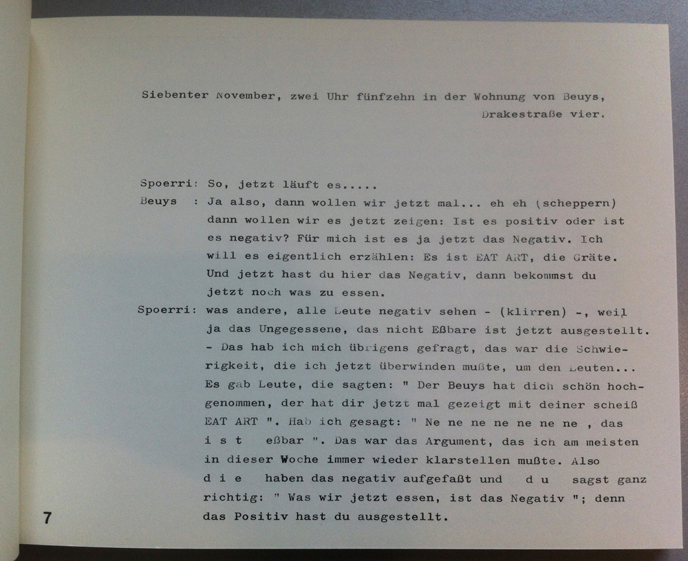 Dieses Künstlerbuch gliedert sich in zwei Teile: Im ersten Teil befindet sich ein Gespräch zwischen Joseph Beuys und Daniel Spoerri. Der zweite Teil enthält Abbildungen der Aktion, fotografiert von Bernd Jansen.