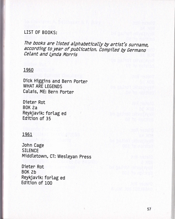 [1] Es waren u.a. folgende Künstler mit ihren Künstlerbüchern vertreten: Dick Higgins / Bern Porter, Dieter Roth, John Cage, Ben Vautier, Eduardo Paolozzi, Daniel Spoerry, George Brecht, Piero Manzoni, Ed Ruscha, Yoko Ono, Robert Filliou, Ray Johnson, Allan Kaprow, Alison Knowles, Gianfranco Baruchello, Mel Bochner, Claes Oldenburg, Terry Atkinson, Michael Baldwin, Philip Corner, Juan Hidalgo, Bruce Nauman, Joseph Kosuth, Andy Warhol, Lawrence Weiner, Carl Andre, Marcel Broodthaers, James Lee Byars, Hanne Darboven, Jan Dibbets, Dan Graham, Sol LeWitt, Richard Tuttle, Bernd & Hilla Becher, Daniel Buren, Ian Burn, Gilbert & George, Douglas Huebler, Art-Language, John Baldessari, John Stezaker …
