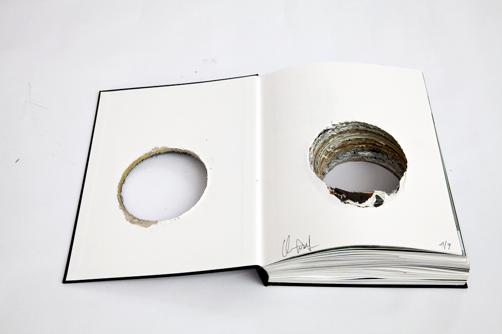 CW | Es war ganz einfach. Der Verlag [Anm.: Verlag für moderne Kunst] hat mich gefragt, ob ich eine Edition machen möchte. In der Überlegung was jetzt eine Edition zu einem Buch sein könnte, war eben die logische Schlussfolgerung, aus dem Buch selbst eine Edition zu machen. Auf S. 196 gibt es einen Cut-Out des Buchstaben C. Den Metallschuber habe ich dann nachträglich gemacht, weil das Buch schwarz ist. Der Schuber aus Metall, das Ausschneiden, also das Handwerkliche spiegelt natürlich meine Arbeitsweise wider. Es zeigt auch, dass es vielleicht nur industriell hergestellt aussieht, aber in Wirklichkeit alles handgemacht ist.