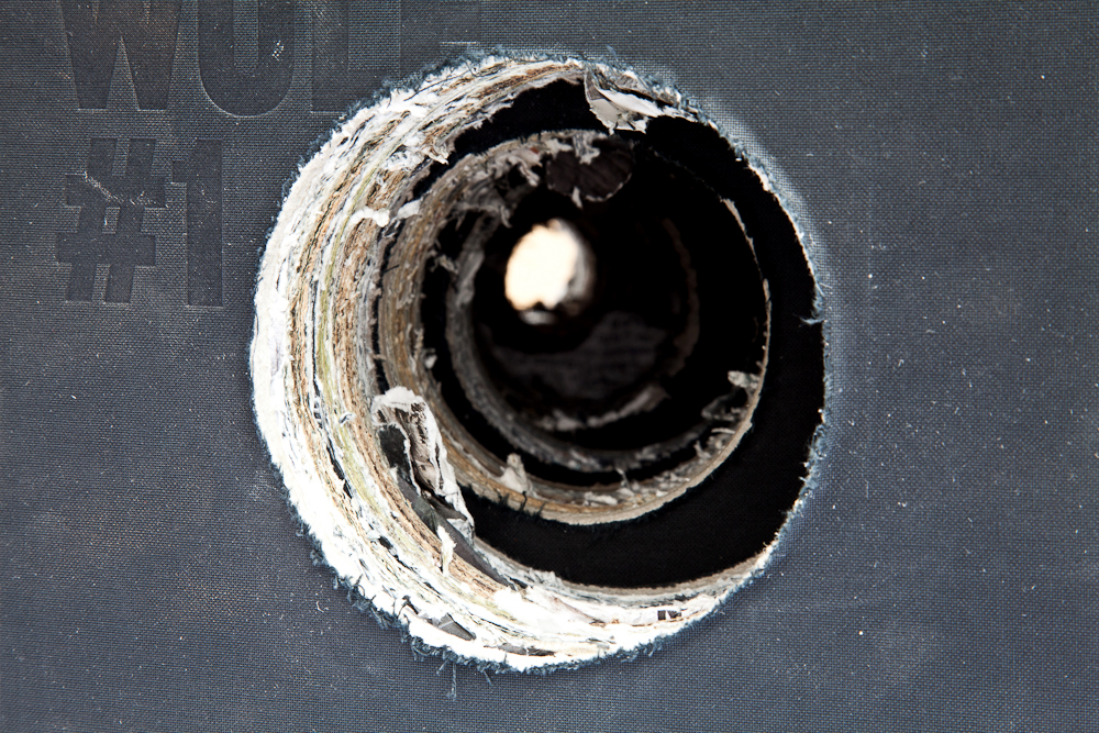 CW | Glory Hole ist natürlich auch ironisch gemeint, da diese ja normalerweise der sexuellen Befriedigung dienen. Die Löcher wurden mit verschieden großen handelsüblichen Dosenbohrer gemacht. Ich mag das auch, mit einem sog. Ready-made zu arbeiten. Es ist ein Loch auf der selben Stelle durch alle neun Bücher, als hätte sich ein Bücherwurm durchgefräst. Es war eine ästhetische Idee, wo man verschiedene Sachen durchstecken kann. Beim größten Loch kann man beispielsweise die Faust durchstecken und das Buch als Armreifen tragen. Das mit den Büchern wird jetzt auch noch weitergehen. Jetzt habe ich auch mit dem Verbrennen angefangen und ein Buch liegt am Dach. [Anm.: Die Edition Glory Hole ist exklusiv nur bei Clemens Wolf erhältlich]