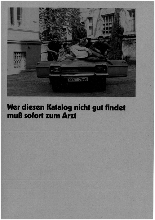 A clear Statement. The title of the book fits into the posing of the four german artists on a car. The non commented catalog has a cover made of paperboard and contains only illustrations.