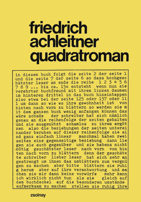 Friedrich Achleitner quadroman 7. März 2013 Return to: Künstlerbuch | Artists‘ book: Franz West. Otium, 1995Volle Auflösung (454 × 648) Image navigation Vorheriges Bild Nächstes Bild Friedrich Achleitner. Quadratroman, Salzburg ; Wien : Residenz-Verlag, 1995