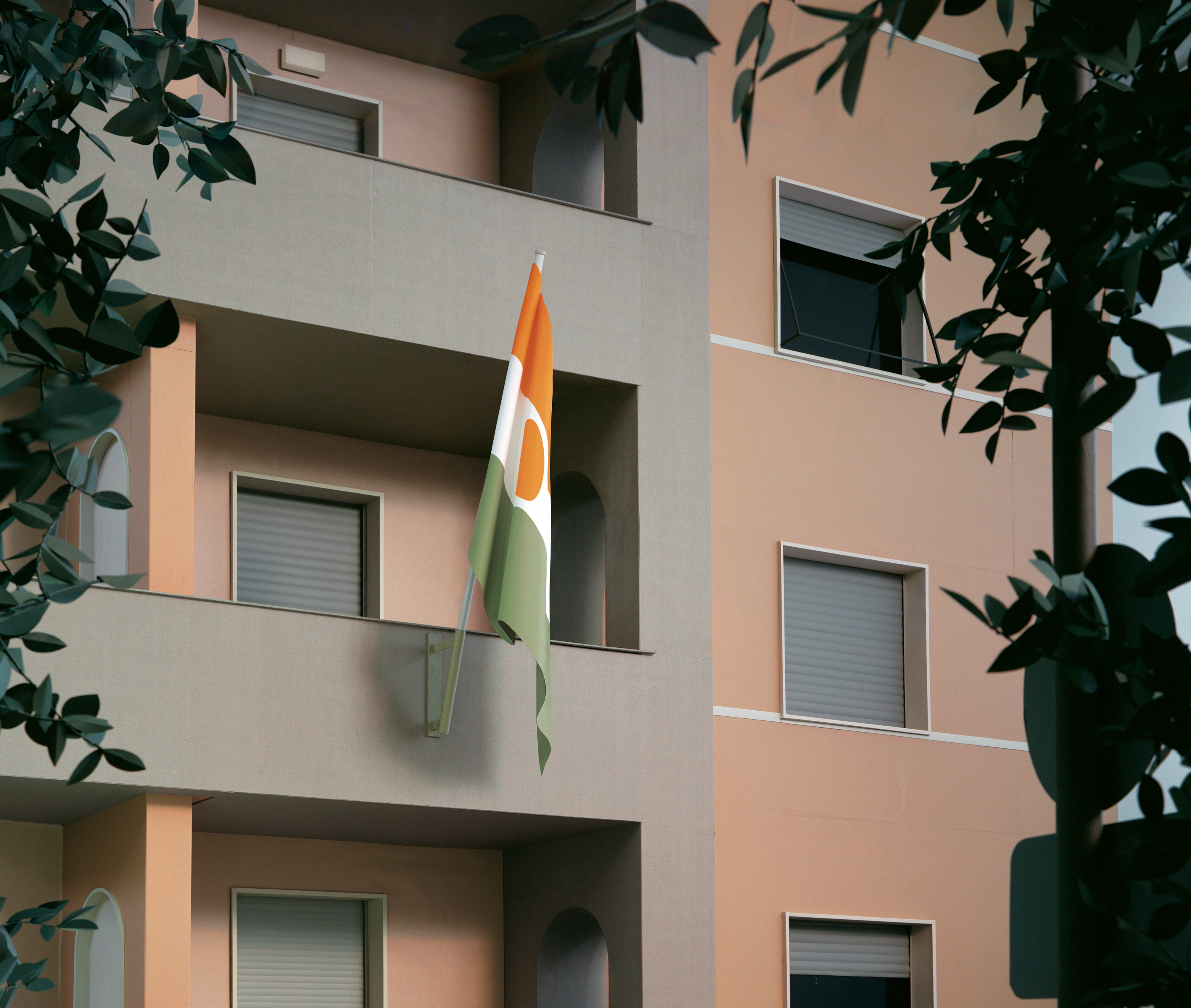 Als Thomas Demand mit seinen Recherchen im Jahr 2005 begann, ging er davon aus, dass er wie gewohnt vorgehen könnte. Er bräuchte sich lediglich die Zeitungen und Magazine zukommen zu lassen und die Pressefotos des Falles zu suchen. Wider Erwarten gab es aber kein Fotomaterial zu dem Überfall. Es war eine Geschichte, zu der das Bild fehlte und somit musste sich Demand – anders als gewohnt – selbst auf den Weg nach Rom machen, um sich die Botschaft des Niger und somit den Ausgangspunkt der verzwickten Lügengeschichte anzusehen. Der Künstler brach also zu den Büroräumlichkeiten der Botschaft auf, die sich in einem unauffälligen 1930er-Jahre Wohnblock in einem Randbezirk von Rom befinden. Niemand würde vermuten, dass sich hinter den Mauern dieses maroden Backsteingebäudes eine Botschaft befindet; einzig die nigerianische Flagge am Balkon im 5. Stock belegte Demand, dass er sich nicht in der Adresse geirrt hatte.