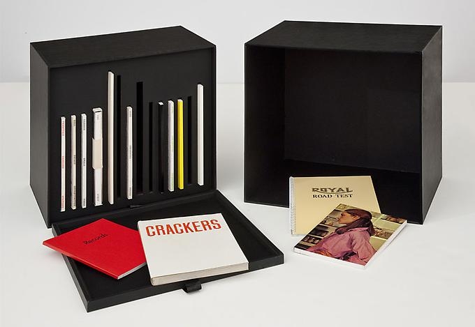 > 14 books within a specially-made handmade black book case; dimensions of each book vary <