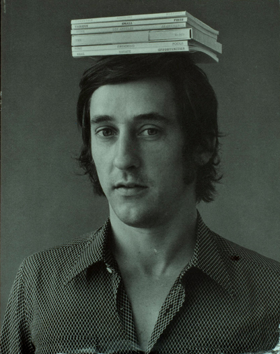 Jerry McMillan: Ed covered with twelve of his books, 1970