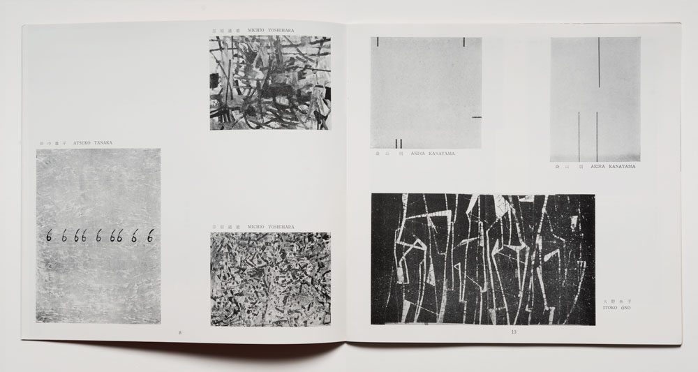 journals_gutai_ph44-45 23. Mai 2013 Return to: Ausstellungskatalog | Gutai. Splendid Playground (Guggenheim Museum, New York 2013)Volle Auflösung (1000 × 533) Image navigation Vorheriges Bild Nächstes Bild Interior spread from Gutai 2. Left page: works by Yoshihara Michio and Tanaka Atsuko; right page: works by Kanayama Akira and Ōno Itoko. © The former members of the Gutai Art Association, photo by Kristopher McKay