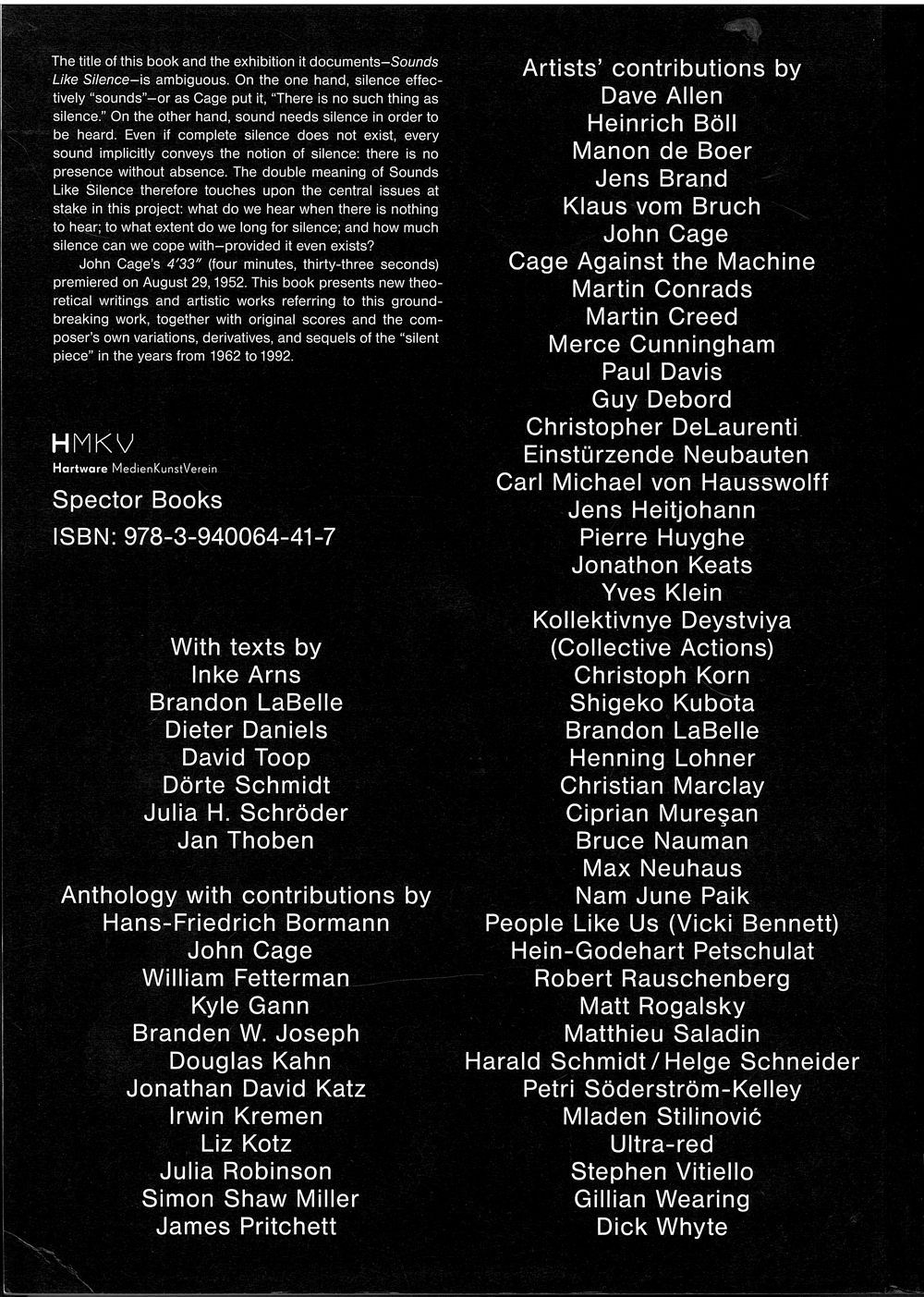 Ausstellungskatalog | Dieter Daniels / Inke Arns (ed.): Sounds Like Silence. John Cage – 4’33” – Silence Today (Spector Books, Leipzig 2012) 8. Juli 2013 Return to: Ausstellungskatalog | Dieter Daniels / Inke Arns (ed.): Sounds Like Silence. John Cage – 4’33” – Silence Today (Spector Books, Leipzig 2012)Volle Auflösung (1000 × 1403) Image navigation Vorheriges Bild Nächstes Bild Ausstellungskatalog | Dieter Daniels / Inke Arns (ed.): Sounds Like Silence. John Cage - 4’33” – Silence Today (Spector Books, Leipzig 2012)