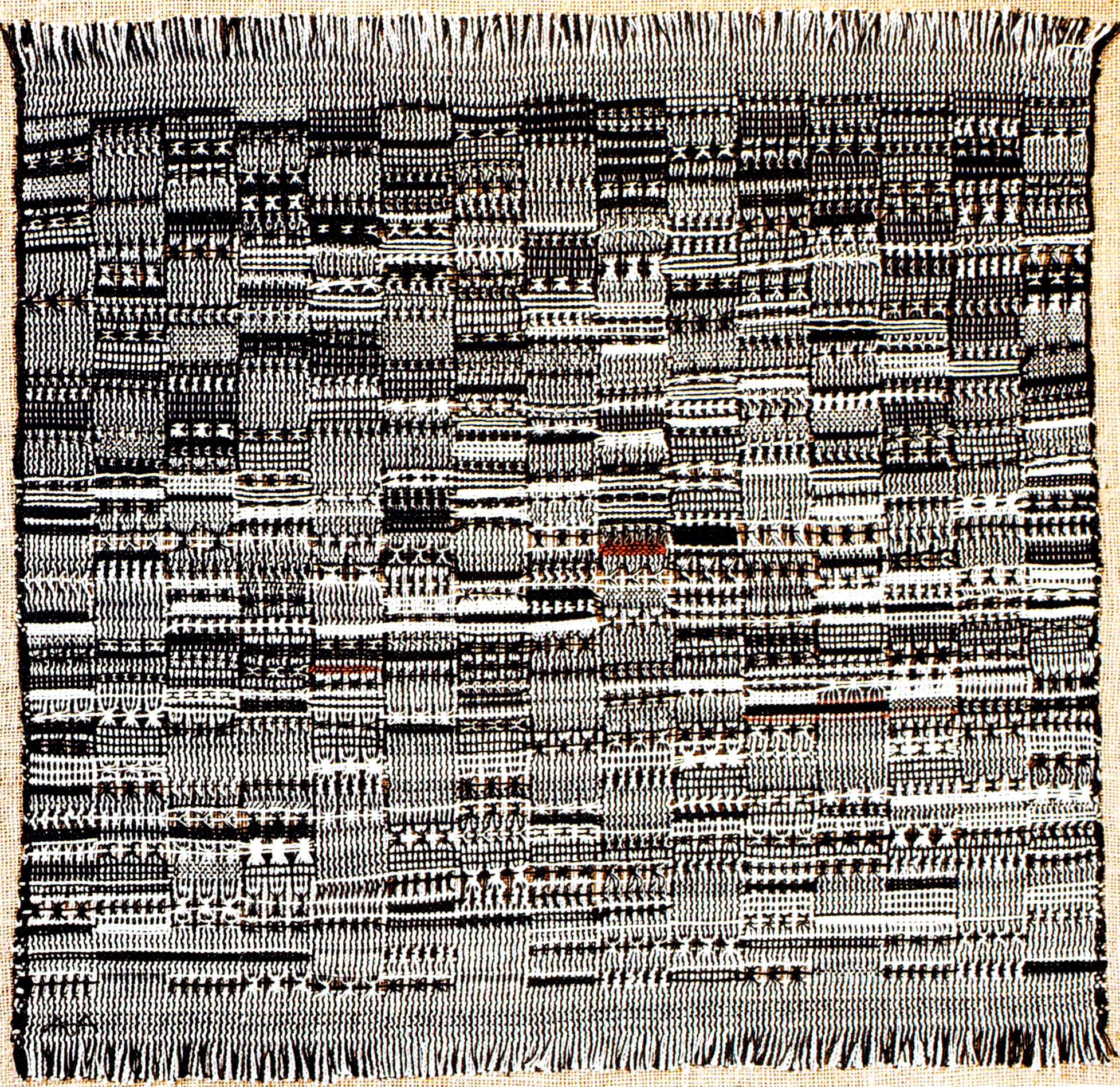 Die schwarz-weiße Bildweberei Open Letter aus dem Jahr 1958 soll durch die Verwendung von linearen ideographischen Schriftzeichen und aufgrund des Titels Offener Brief den Betrachter zum „lesen“ veranlassen.[23] Das kleine Format mit rund 59 x 60 cm ist annähernd quadratisch und enthält eine Signatur in der linken unteren Ecke, wodurch die Leserichtung in Richtung der Kettfäden vorgegeben wird. Diese Bildweberei basiert auf einer einfachen Leinwandbindung mit Baumwollfäden, die Gewebevariationen in verschiedenen Bereichen aufweist.[24] Dieses Werk ist ein Paradebeispiel für Anni Albers’ Verwendung von Doppellagen als organisiertes Prinzip in ihren Webarbeiten. Die Kettfäden bestehen aus einer Reihe von zwei weißen Fäden, wobei die erste jeweils ein Spiralfaden ist, gefolgt von zwei schwarzen.[25] Leclerq spricht von zwölf Ketteinheiten oder insgesamt 48 Kettfäden, die in Streifen gleicher Breite eingeteilt sind. Hier muss ihm widersprochen werden, da es sich bei Open Letter um insgesamt 15 Streifen handelt, die sich in Abständen von je vier Zentimeter durch Bänder aus der Leinwandbindung, welche die Breite des Webstückes queren, unterteilen. Auch wenn diese Streifen annähernd unsichtbar sind, bewirken sie ein geometrisches Muster, bei dem sich die beiden Nichtfarben Schwarz und Weiß einander abwechseln. Die vielen Gewebevariationen in dieser Bildweberei werden durch verschiedene Kombinationen unterschiedlicher Typen, Texturen und Farben der Schuss- und Kettfäden kreiert. Bei diesem Stück lohnt es sich, genauer hinzusehen, denn Albers verwendet auch hier weiße, schwarze und rote zusätzliche Schussfäden. Der rote Zierfaden taucht zwar nur fünf Mal – von links gezählt – in der fünften, neunten sowie zwölften bis dreizehnten Reihe auf, jedoch verleiht gerade dieser farbliche Akzent dem Stück eine besondere Ausdruckskraft – quasi einen roten Faden, der sich durch das gesamte Werk zieht. Die schwarzen und weißen Schussfäden sind in der Leinwandbindung mit einer der Ketten eingewebt, wodurch die visuelle Unterscheidung zwischen Grundschiffchen und zusätzlichem Brokatschiffchen verwischt. Jedes Rechteck fügt sich eng an seinen Nachbarn und weist eine komplexe Musterung auf, was die Bildweberei wie einen kompakt beschriebenen Brief wirken lässt.[26] Albers schuf bei Open Letter eine Komposition aus einzelnen Musterelementen, die bei genauerer Betrachtung durch die Anordnung von visuellen Informationen Inhalt und Bedeutung zu vermitteln scheinen. Sie sah Parallelen zwischen diesen Sujets und dem andinen Textilmuster der Tocapu-Tuniken und wollte – wie sie im einleitenden Zitat im Ausstellungskatalog Pictorial Weavings aus dem Jahr 1959 betont – eine Möglichkeit finden, den Fäden wieder eine Ausdrucksqualität zu verleihen.[27] Viele der Arbeiten, die sie in der gleichnamigen Wanderausstellung präsentierte, sind dahin gehend bemerkenswert, da alle in technischer, bildlicher und ideographischer Hinsicht einen Bezug zum andinen Grundmuster herstellen.[28] An dieser Stelle muss deutlich erwähnt werden, dass sich Albers zwar auf die Tuniken mit den Tocapu-Musterungen stützt, ihre Zeichen jedoch keine direkten Informationen enthalten und für den Betrachter des Textils abstrakte Piktogramme bleiben, die nicht entziffert werden können. Die Bildweberei Open Letter gibt einen Aufschluss über die zahlreichen Variationen dieser Muster und zeigt, wie sich Anni Albers hinsichtlich der Formensprache ihrer Arbeiten weiterentwickelte. Bei ihren Bildwebereien aus dieser Zeit stellen die Strukturen selbst ideographische Funktionen dar, wobei der spielerischer Umgang mit den Materialien ihre hohe Kenntnis der Materialeigenschaften und -möglichkeiten demonstriert.[29]