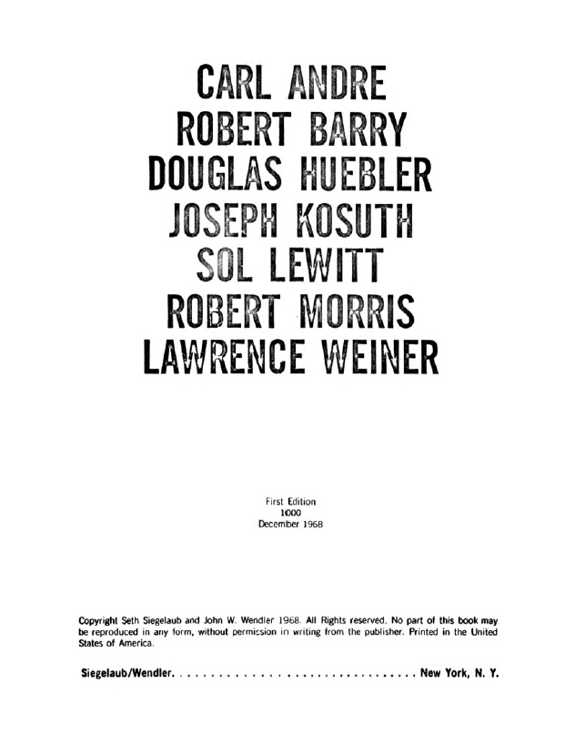 [3] Seth Siegelaub / John W. Wendler (Hg.), „Xerox book“. Carl Andre / Robert Barry / Douglas Huebler / Joseph Kosuth / Sol LeWitt / Robert Morris / Lawrence Weiner (Kat. Ausst., Galerie Seth Siegelaub, New York 1968), New York 1968, o.P.