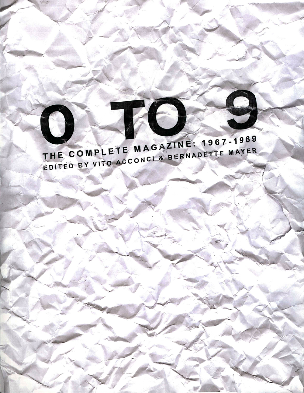 Self-published from 1967–1969 by Vito Acconci and Bernadette Mayer, 0 to 9 originally appeared in seven inexpensive, mimeographed, staple-bound issues that were sold for a dollar an issue. Although democratically conceived, the original issues ultimately were printed in small runs of between 100 and 350 copies. Very different from conventional art and poetry magazines from the period in terms of content, design and distribution, 0 to 9 consisted mostly of original, language or idea-based contributions by artists and poets, establishing a new kind of “dematerialized,” do-it-yourself exhibition context beyond the existing official gallery and magazine system.
