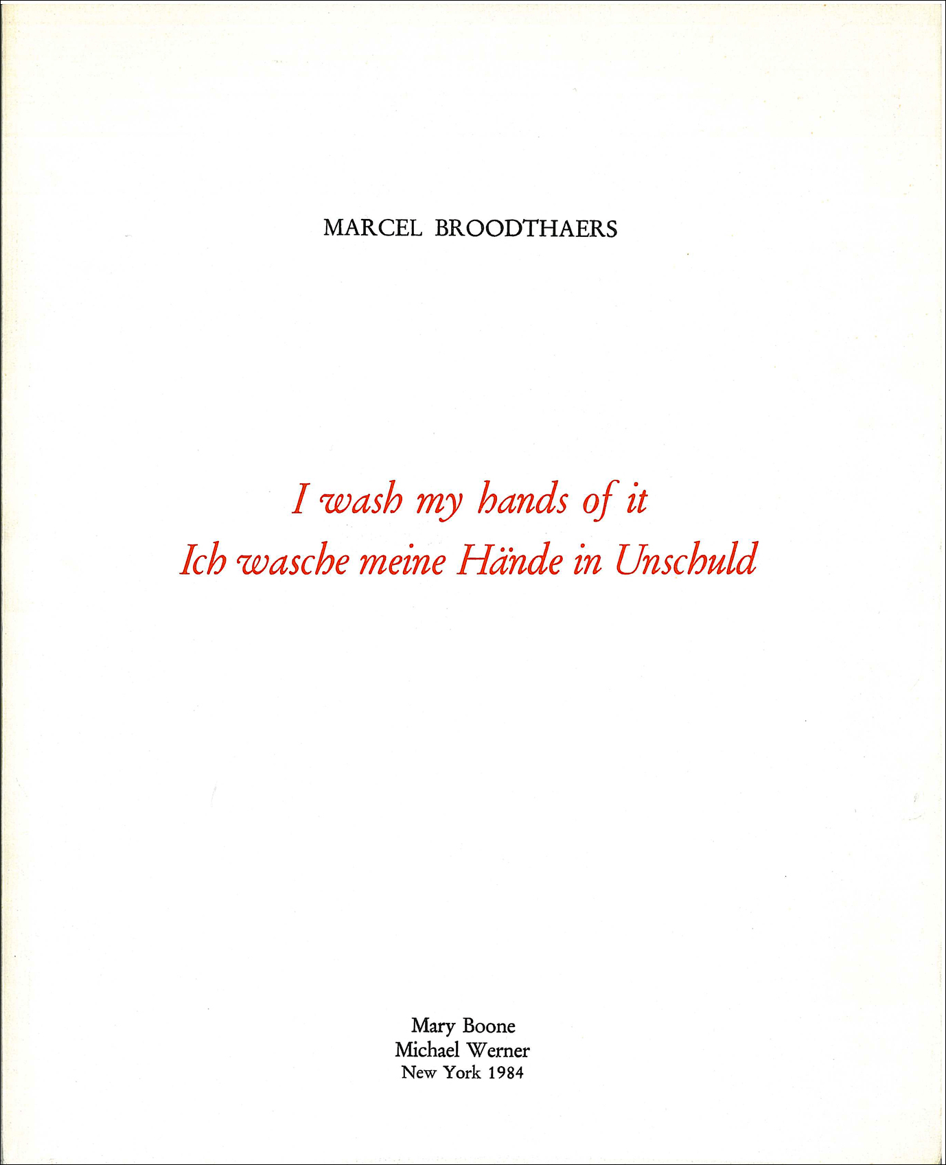 I wash my hands of it 28. März 2014 Return to: Künstlerbücher von John Baldessari, Hanne Darboven und Marcel Broodthaers in den Vitrinen der mumok BibliothekVolle Auflösung (1378 × 1697) Image navigation Vorheriges Bild Nächstes Bild Marcel Broodthaers, I wash my hands of it/ Ich wasche meine Hände in Unschuld