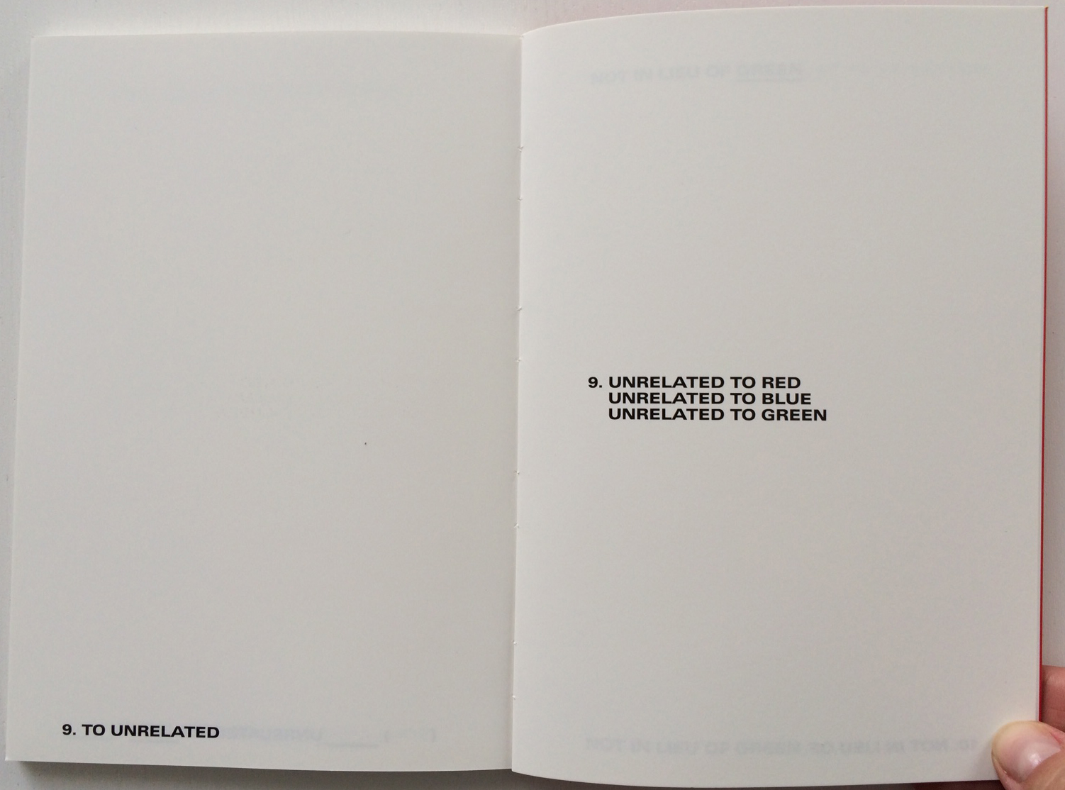 Lawrence Weiner, GREEN AS WELL AS BLUE AS WELL AS RED (Zédélé Éditions, 1972/2012) 28. September 2014 Return to: Künstlerbuch | Artists‘ book: Lawrence Weiner. Green As Well As Blue As Well As Red (1972 / Zédélé Éditions, Reprint 2012)Volle Auflösung (1502 × 1114) Image navigation Vorheriges Bild Nächstes Bild Lawrence Weiner, GREEN AS WELL AS BLUE AS WELL AS RED (Zédélé Éditions, 1972/2012)