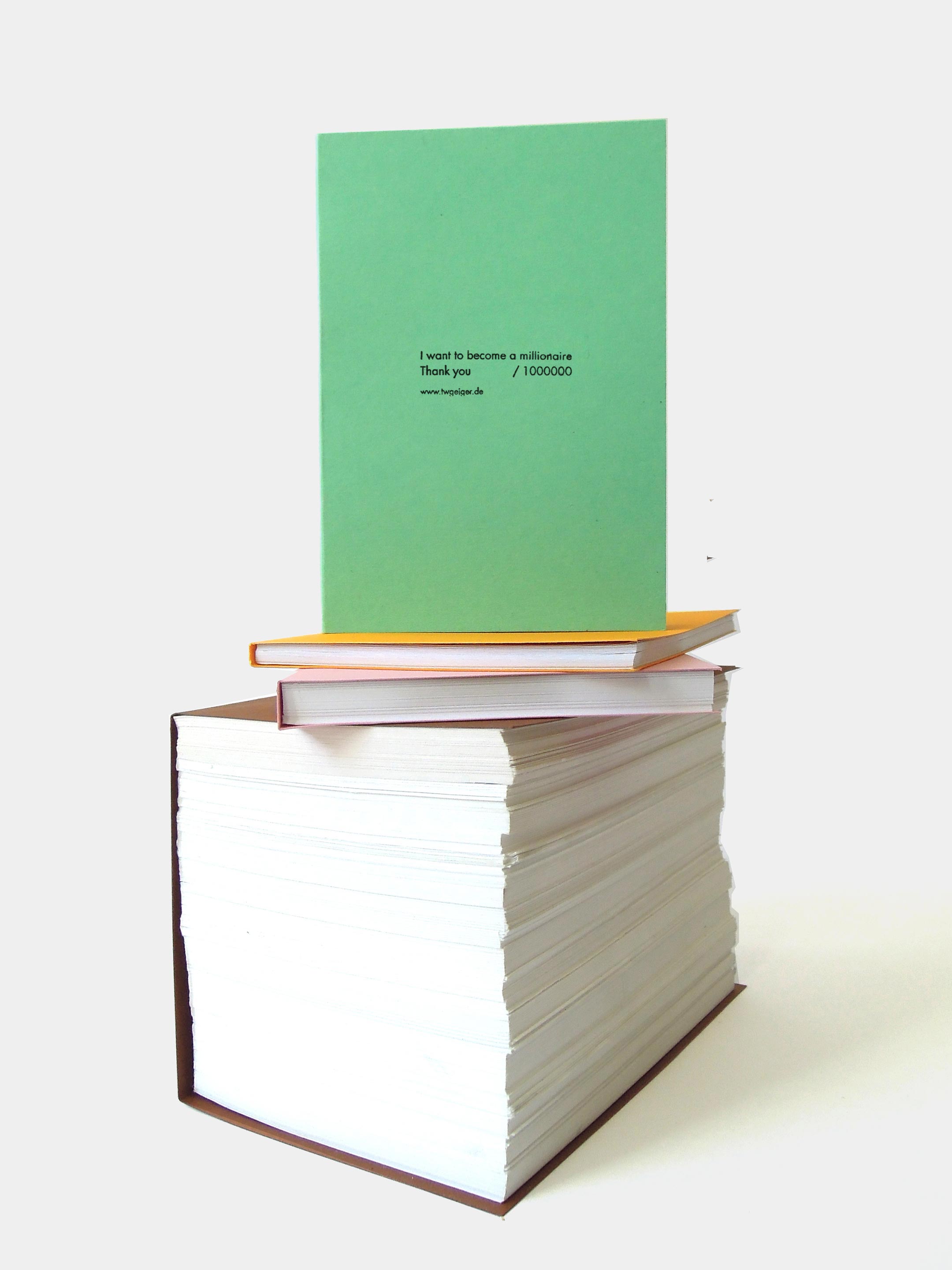These books are part of Thomas Geiger’s ongoing, economical performance I want to become a millionaire. Since 2010, Geiger offers signed and numbered sheets for one euro a piece. What started as a street performance, became a private funding system to support Geiger’s collaborative projects which are dedicated to public space and publishing: Kunsthalle3000, The Festival of Minimal Actions and Mark Pezinger Books. These books contain 10, 50, 100 or 1000 of Geigers signed sheets. (source: Mark Pezinger Books)